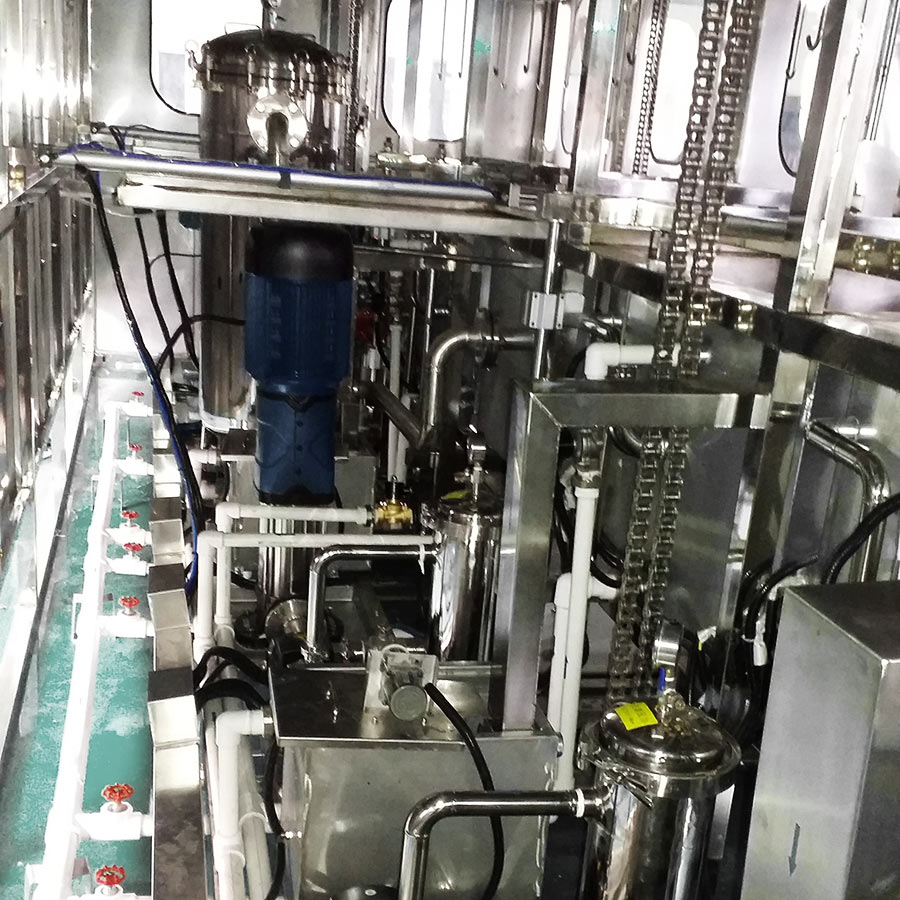 該設備有自動上下料及轉角系統、超聲波清洗系統,自動拋動、自動溢流和油污分離裝置,噴淋系統、自動高壓切水系統、自動烘干系統。機械手自動輸送系統采用高精度直線導軌配合高精度位置檢測傳感器,機械手可以準確的實現工件的抓取和放置。自動進排液和自動加溫系統完全實現了無人干預,自動運行,很大程度上降低了工人的勞動強度。先進的霧氣處理系統可以將清洗時產生的霧氣冷凝回流,空氣經過濾和活性炭吸附后排出。