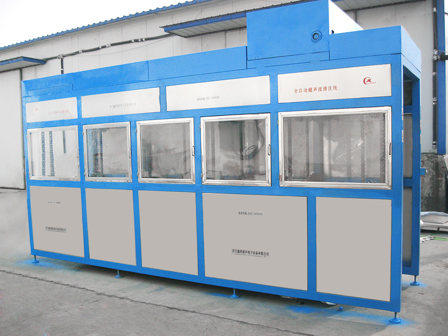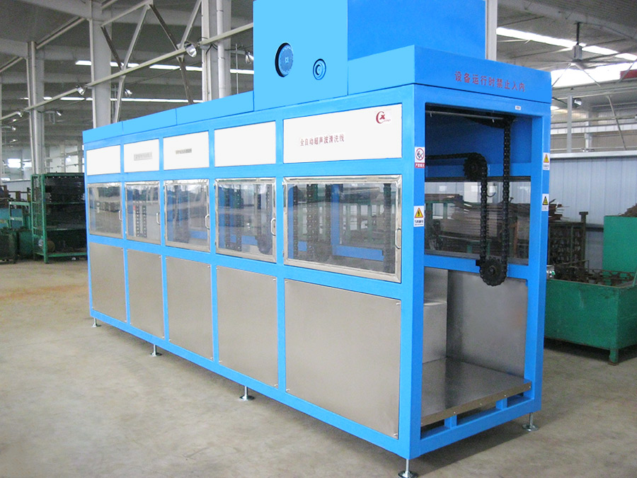 該設備有自動上下料及轉角系統、超聲波清洗系統,自動拋動、自動溢流和油污分離裝置,噴淋系統、自動高壓切水系統、自動烘干系統。機械手自動輸送系統采用高精度直線導軌配合高精度位置檢測傳感器,機械手可以準確的實現工件的抓取和放置。自動進排液和自動加溫系統完全實現了無人干預,自動運行,很大程度上降低了工人的勞動強度。先進的霧氣處理系統可以將清洗時產生的霧氣冷凝回流,空氣經過濾和活性炭吸附后排出。