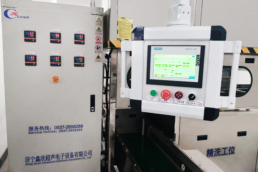 該設(shè)備有自動上下料及轉(zhuǎn)角系統(tǒng)、超聲波清洗系統(tǒng),自動拋動、自動溢流和油污分離裝置,噴淋系統(tǒng)、自動高壓切水系統(tǒng)、自動烘干系統(tǒng)。機械手自動輸送系統(tǒng)采用高精度直線導(dǎo)軌配合高精度位置檢測傳感器,機械手可以準(zhǔn)確的實現(xiàn)工件的抓取和放置。自動進排液和自動加溫系統(tǒng)完全實現(xiàn)了無人干預(yù),自動運行,很大程度上降低了工人的勞動強度。先進的霧氣處理系統(tǒng)可以將清洗時產(chǎn)生的霧氣冷凝回流,空氣經(jīng)過濾和活性炭吸附后排出。